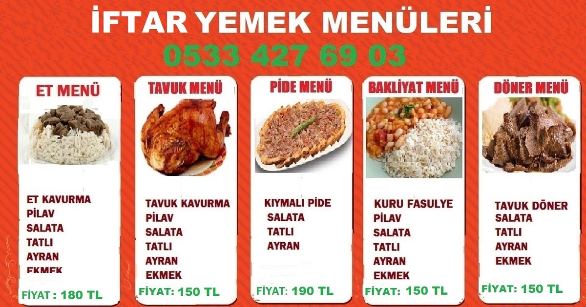 Yemek siparişi için günün her saati ( 7 / 24 ) bizi arayabilir, yemek Siparişi verebilir ve menü ve fiyatlar konusunda bilgi sorabilirsiniz. ftar yemeği organizasyonu kapsamında sunduğumuz menüler, her bütçeye uygun seçeneklerle hazırlanmaktadır. Et menüsü, tavuk menüsü, pide menüsü, bakliyat menüsü ve tavuk döner menüsü gibi çeşitli alternatiflerimiz bulunmaktadır. Kişi başı fiyatlarımız 130 TL ile 160 TL arasında değişmektedir. Ayrıca, günlük irmik helvası gibi ekstra lezzetler de sunmaktayız.